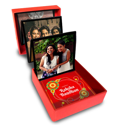 This personalised rakshabandhan popup box with four photos, your message and rakhi is unique way to wish and celebrate this occasion with your brother. The strip of pictures along with your personalised message on high-quality paper is nicely packed in the little box and makes a wonderful gift.