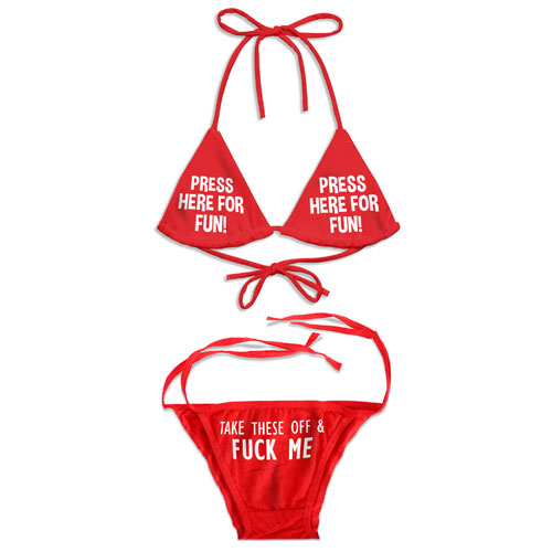 ● Includes: 2 pieces - top and bottom with print that reads Press Here For Fun and Take These Off And Fuck Me